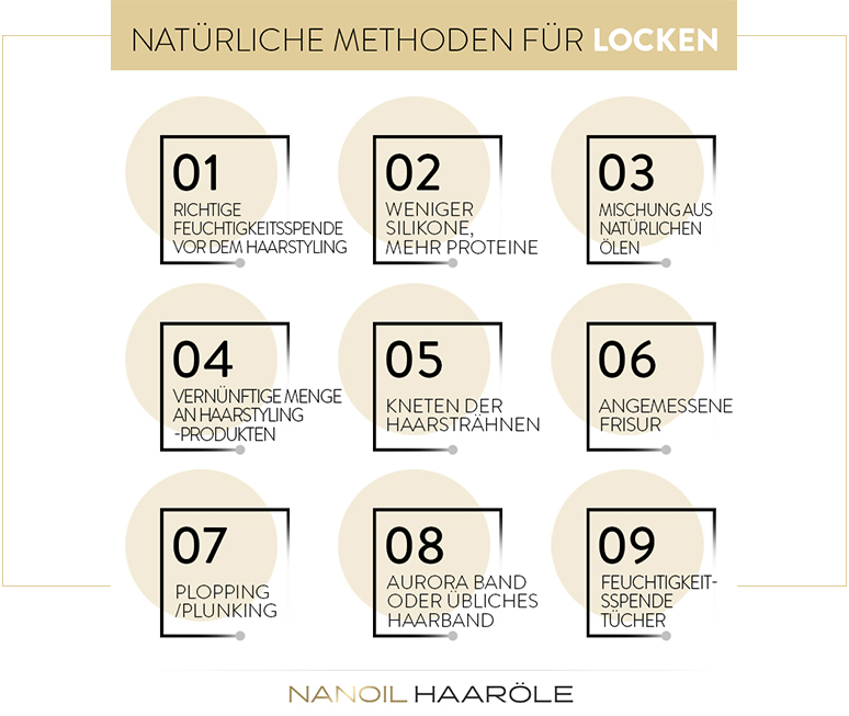 Viele Frauen machen vor dem Schlafengehen einen Zopf, um sanfte Welle zu bekommen, oder hohe Haarknoten. Die Haarknoten werden am Morgen aufgeflochten und die Haare sollten dann sanft mit Fingern ausgekämmt werden. Bevor Sie jedoch einen Zopf oder Haarknoten machen, tragen Sie eine sanfte Lotion für das Haarstyling auf, und am Morgen verwenden Sie einen Spray, der die Locken fixiert.